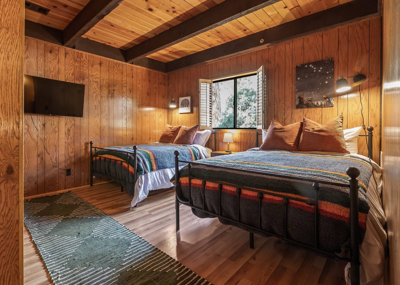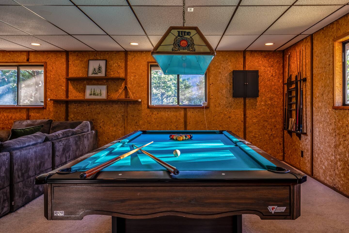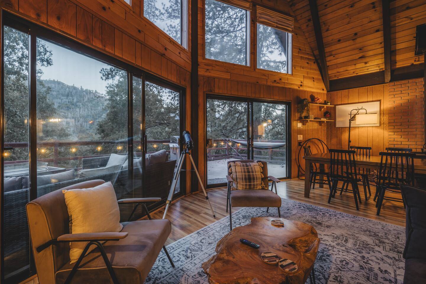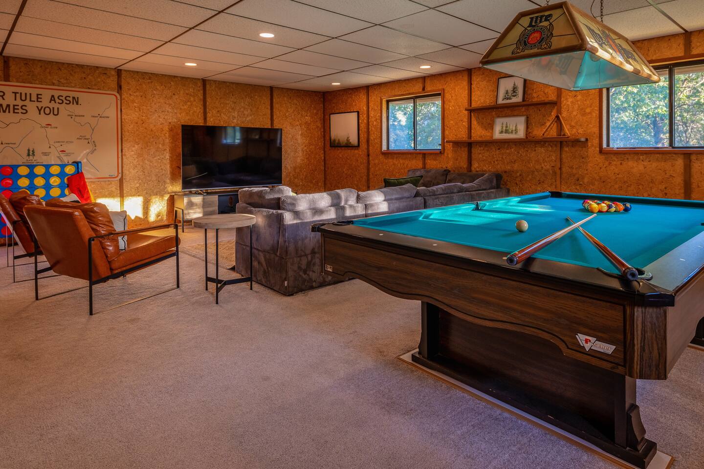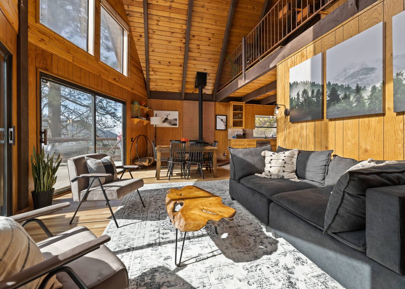 Key Features Include: -Stunning Mountain Views -3,000 SF suitable for large groups -Hot Tub -Pet Friendly -EV Charger Level 2 (Up to 30 miles per hour) -Private and Secluded Location -Easy access off main highway CA-190 -Deer Sightings in the back yard -Library Loft with Books and Record Player -Game Room with Arcade Games -Pool Table and Darts with Wet Bar -Board and Card Games -Fully Stocked Kitchen with Stainless Steel Appliances -Hammock on the deck amongst the trees -Outdoor Games including Cornhole -Fans in all bedrooms and portable AC for master bedroom available in summer -High Speed Internet WHAT GUESTS HAVE TO SAY "This cabin was amazing! It was exactly how it looked like in the pictures, loved how quiet it was and we had so much fun with the game room. " "Chris’s place was one of the best locations that we’ve been to. It’s peaceful and quiet. The locals are friendly. There are many locations around the Airbnb to explore such as the Stagg Tree and Coffee Camp which are both part of Chris’s recommendations. Overall, it’s a great place and Chris is a great host and this place is definitely worth visiting" "This is a beautiful cabin and the Mountain View’s were gorgeous. We would wake up to deer in the backyard and birds chirping with a fresh mountain breeze. The locals at the grill down the street were amazing and the food was amazing. " INSIDE SPACE This A-frame style cabin boasts 3 bedrooms, 3 bathrooms, and almost 3,000 square feet of living space for up to 10 guests to enjoy comfortably (up to 12 guests max upon request). The mountain views can be seen from the expansive windows whether you’re tucked away in the loft enjoying a good book, dining with friends and family by the wood-burning stove, or playing board games in the main living room. KITCHEN+DINING A dedicated coffee + tea bar will delight enthusiasts each morning and includes a drip coffee maker, coffee grinder, and French press coffee maker. New Stainless Steel appliances are provided as well as smaller appliances like a blender, waffle maker, and 4-slice toaster! A wooden dining table sits next to the wood burning stove and provides seating for 6 with space to add 2 additional chairs. BEDROOMS There are a total of 3 bedrooms within the cabin. 2 bedrooms are located on the main level, one with a queen bed and the other with 2 full size beds. The private master bedroom suite is on the top floor and contains a king size bed as well as a crib for infants located in the closet. Each bedroom has full size closets and hangers for clothing storage. Bedrooms all have new euro-plush hybrid mattresses, Parachute luxury bed linens, and Parachute duvet comforters. BATHROOMS There are two full bathrooms and one half bathroom in this home, each of them stocked with all the essentials you need for the duration of your stay. The master bedroom on the top floor contains an ensuite bathroom, while one full bathroom is located just across the hallway and easily accessible for the guests staying on the main level. Worry about nothing with these thoughtfully stocked bathrooms that provide everything you need and more. BONUS ROOMS Dedicated workspaces in Master Suite and in Loft. Entertainment level includes a wet bar, pool table, dart board, board games, arcade games, and theater space with 75” Smart TV. FAMILY FRIENDLY Kid-Friendly amenities include activity closet, kid friendly books and board games, life size Connect 4, PS4 video game console, retro arcade games, kid size plates and cups, a play pen, a crib, and a high chair. OUTSIDE SPACE Walk out from the living and dining room onto the back deck where you can enjoy a stainless steel grill, hammock, sectional sofa, full size corn hole, and fire pit. Additional backyard amenities include a hot tub facing Slate Mountain and a tree swing on the largest oak tree. Over 1 acre of oak trees, ponderosa pine trees, cedar pine trees, and a private vegetable garden are yours to explore.