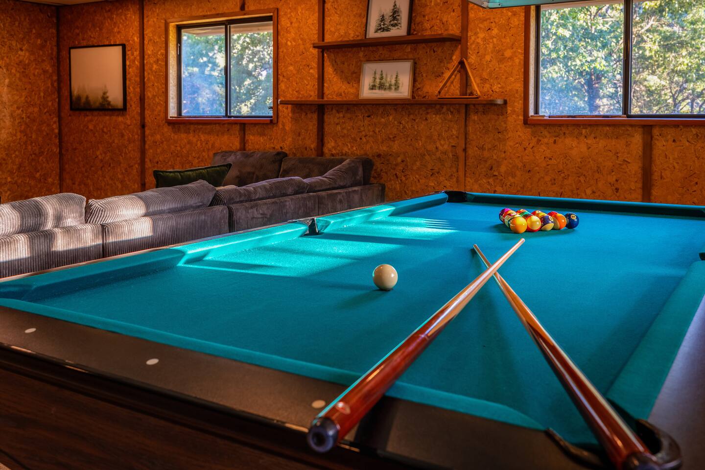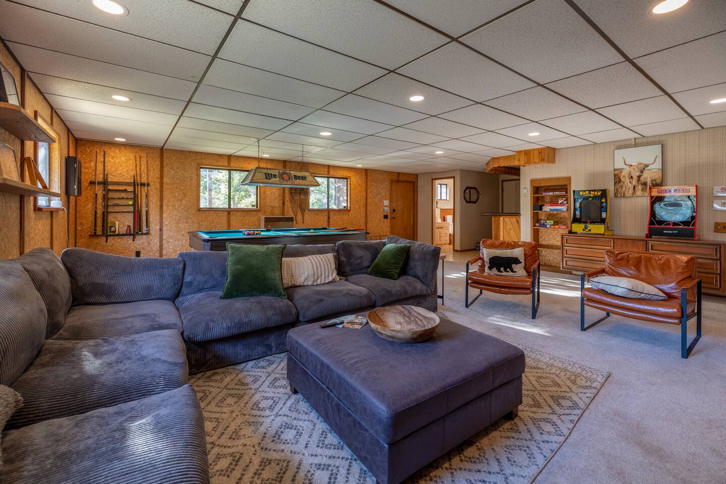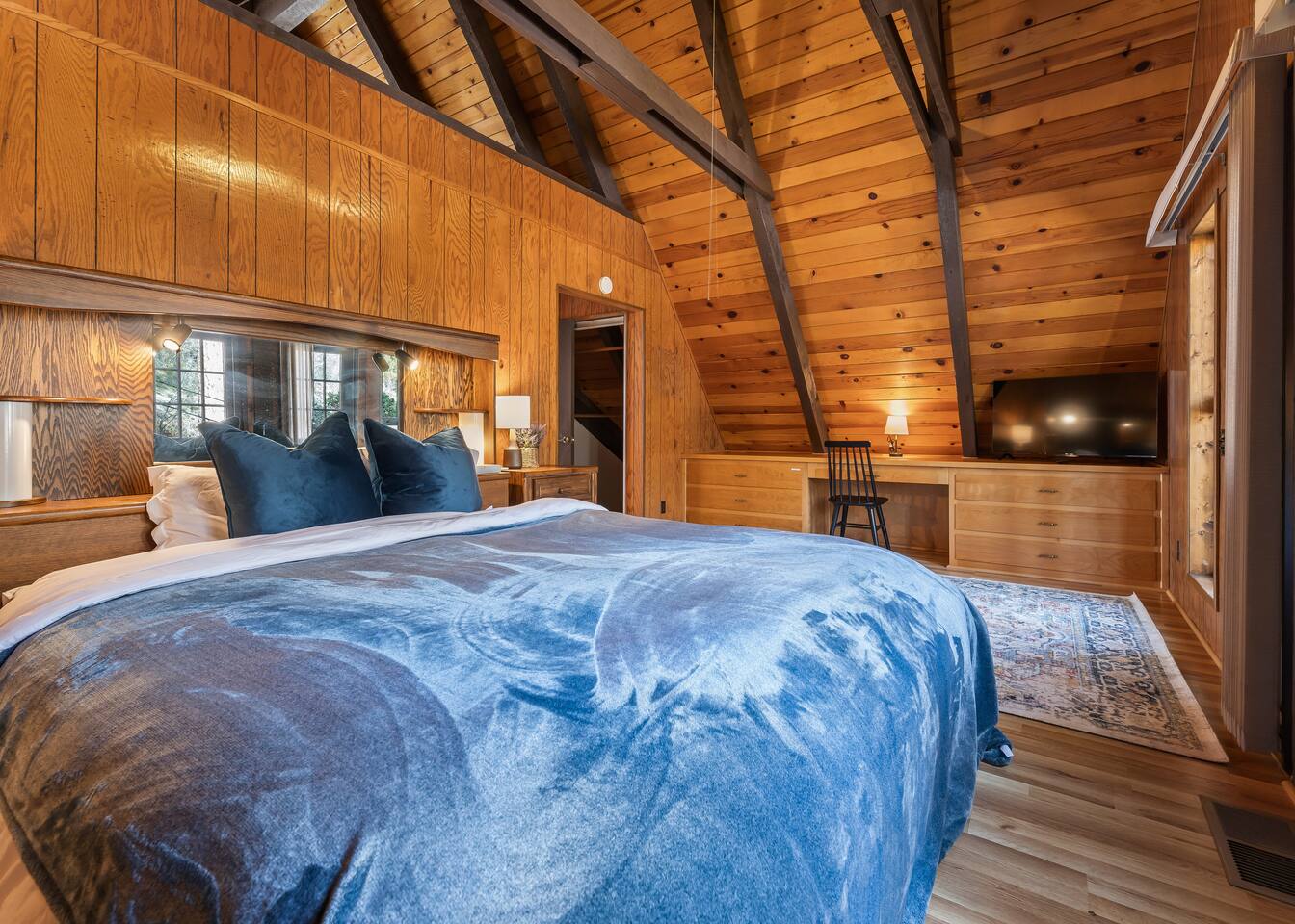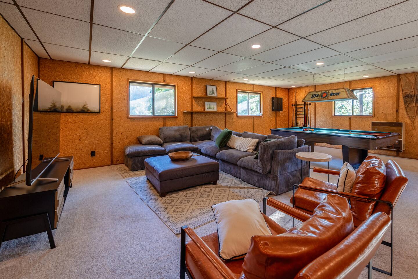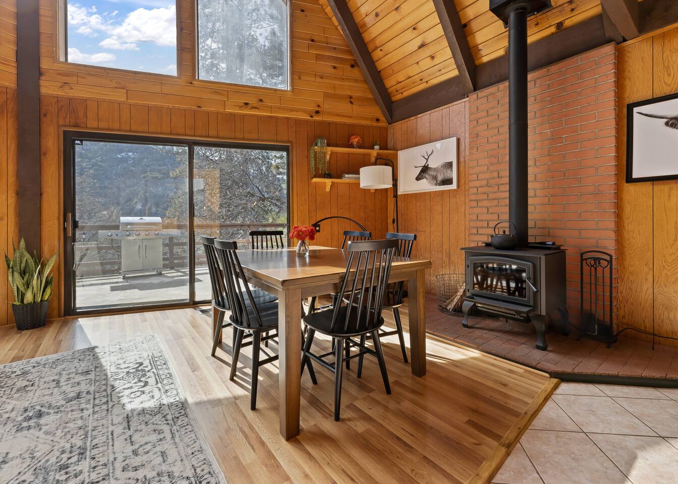 Key Features Include: -Stunning Mountain Views -3,000 SF suitable for large groups -Hot Tub -Pet Friendly -EV Charger Level 2 (Up to 30 miles per hour) -Private and Secluded Location -Easy access off main highway CA-190 -Deer Sightings in the back yard -Library Loft with Books and Record Player -Game Room with Arcade Games -Pool Table and Darts with Wet Bar -Board and Card Games -Fully Stocked Kitchen with Stainless Steel Appliances -Hammock on the deck amongst the trees -Outdoor Games including Cornhole -Fans in all bedrooms and portable AC for master bedroom available in summer -High Speed Internet WHAT GUESTS HAVE TO SAY "This cabin was amazing! It was exactly how it looked like in the pictures, loved how quiet it was and we had so much fun with the game room. " "Chris’s place was one of the best locations that we’ve been to. It’s peaceful and quiet. The locals are friendly. There are many locations around the Airbnb to explore such as the Stagg Tree and Coffee Camp which are both part of Chris’s recommendations. Overall, it’s a great place and Chris is a great host and this place is definitely worth visiting" "This is a beautiful cabin and the Mountain View’s were gorgeous. We would wake up to deer in the backyard and birds chirping with a fresh mountain breeze. The locals at the grill down the street were amazing and the food was amazing. " INSIDE SPACE This A-frame style cabin boasts 3 bedrooms, 3 bathrooms, and almost 3,000 square feet of living space for up to 10 guests to enjoy comfortably (up to 12 guests max upon request). The mountain views can be seen from the expansive windows whether you’re tucked away in the loft enjoying a good book, dining with friends and family by the wood-burning stove, or playing board games in the main living room. KITCHEN+DINING A dedicated coffee + tea bar will delight enthusiasts each morning and includes a drip coffee maker, coffee grinder, and French press coffee maker. New Stainless Steel appliances are provided as well as smaller appliances like a blender, waffle maker, and 4-slice toaster! A wooden dining table sits next to the wood burning stove and provides seating for 6 with space to add 2 additional chairs. BEDROOMS There are a total of 3 bedrooms within the cabin. 2 bedrooms are located on the main level, one with a queen bed and the other with 2 full size beds. The private master bedroom suite is on the top floor and contains a king size bed as well as a crib for infants located in the closet. Each bedroom has full size closets and hangers for clothing storage. Bedrooms all have new euro-plush hybrid mattresses, Parachute luxury bed linens, and Parachute duvet comforters. BATHROOMS There are two full bathrooms and one half bathroom in this home, each of them stocked with all the essentials you need for the duration of your stay. The master bedroom on the top floor contains an ensuite bathroom, while one full bathroom is located just across the hallway and easily accessible for the guests staying on the main level. Worry about nothing with these thoughtfully stocked bathrooms that provide everything you need and more. BONUS ROOMS Dedicated workspaces in Master Suite and in Loft. Entertainment level includes a wet bar, pool table, dart board, board games, arcade games, and theater space with 75” Smart TV. FAMILY FRIENDLY Kid-Friendly amenities include activity closet, kid friendly books and board games, life size Connect 4, PS4 video game console, retro arcade games, kid size plates and cups, a play pen, a crib, and a high chair. OUTSIDE SPACE Walk out from the living and dining room onto the back deck where you can enjoy a stainless steel grill, hammock, sectional sofa, full size corn hole, and fire pit. Additional backyard amenities include a hot tub facing Slate Mountain and a tree swing on the largest oak tree. Over 1 acre of oak trees, ponderosa pine trees, cedar pine trees, and a private vegetable garden are yours to explore.