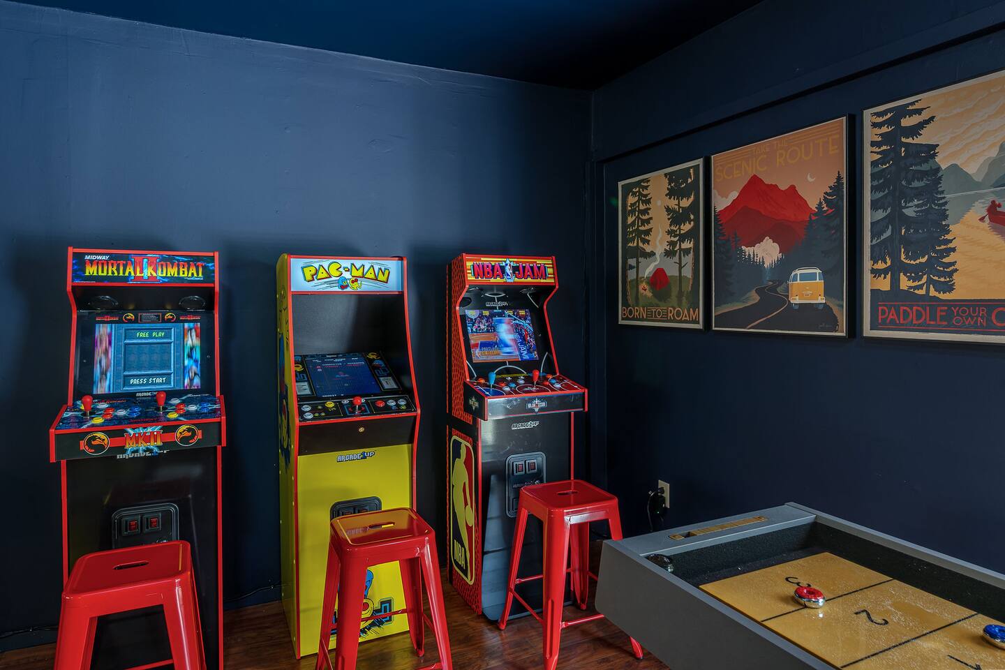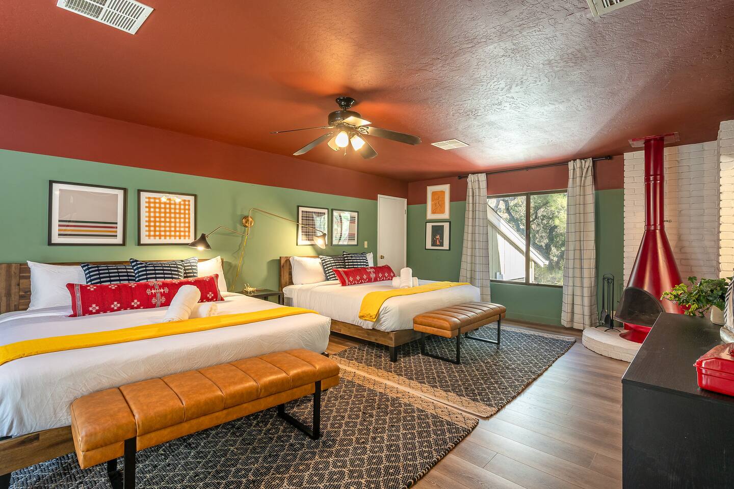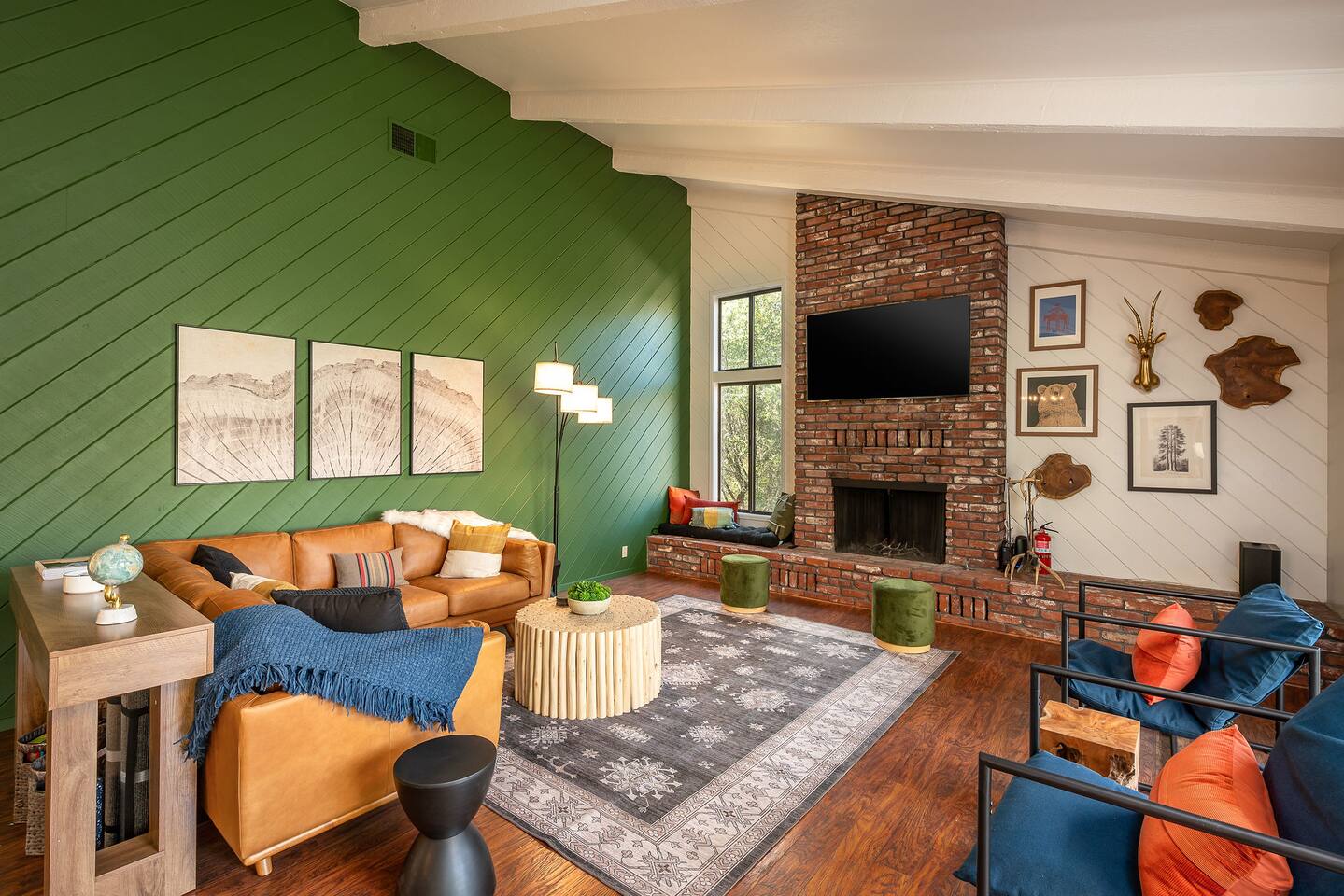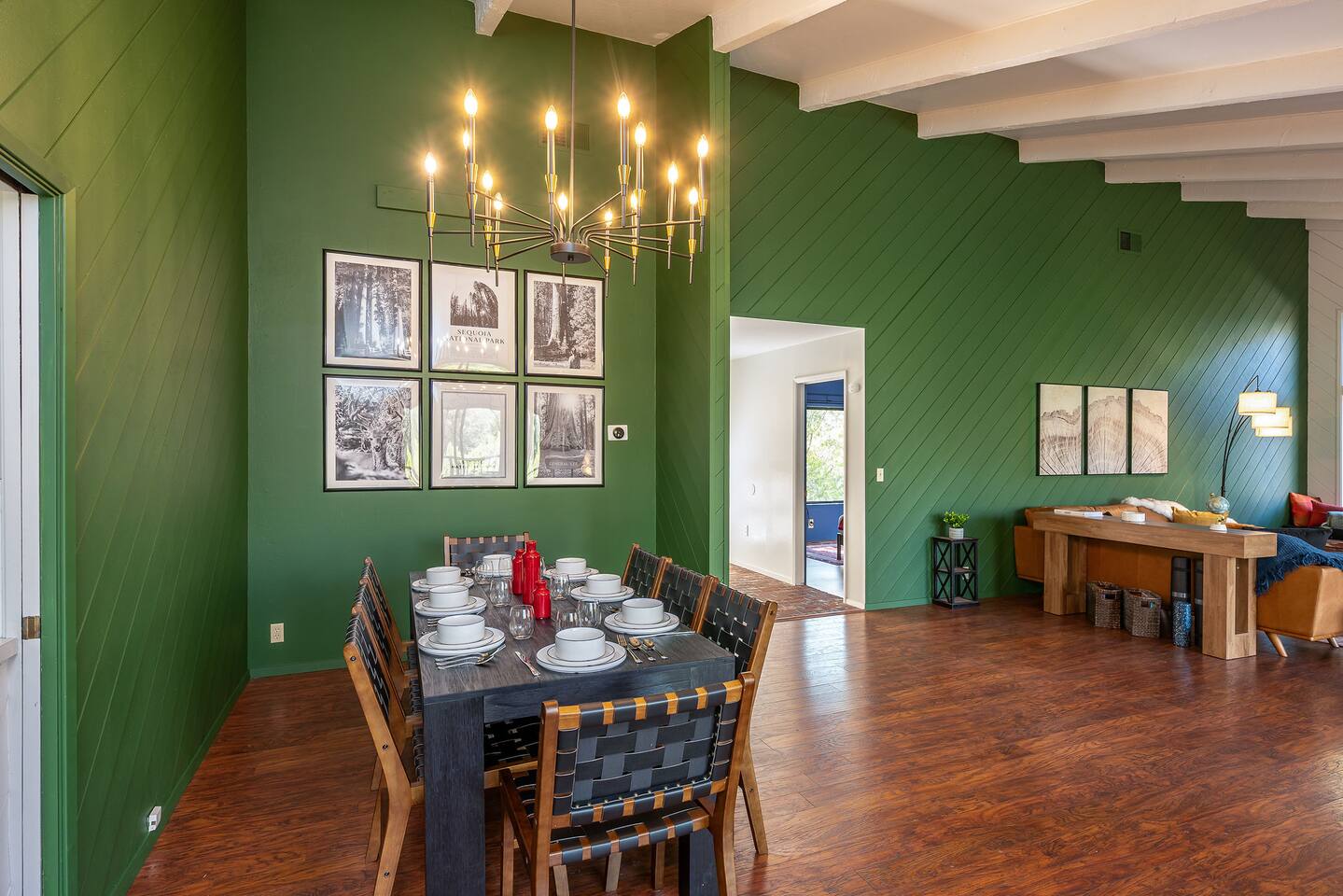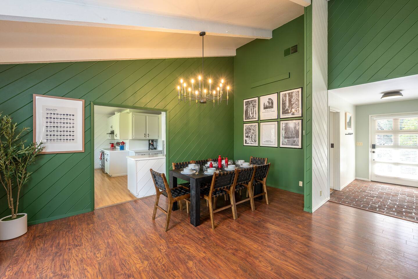 YOUR PROPERTY This beautiful home offers the perfect balance of style, comfort, and functionality. Two spacious bedrooms, two full bathrooms, and a half bath ensure plenty of space for everyone. Each bathroom is thoughtfully stocked with essentials, so you can relax and focus on enjoying your stay. KITCHEN & DINING The full kitchen is fully equipped with modern appliances, ample counter space, and everything you need to prepare meals with ease. Just off the kitchen, the dining area features a large table set beneath a modern chandelier, accented by striking green walls and Sequoia National Park artwork — the perfect backdrop for shared meals and conversation. BEDROOMS & BATHROOMS Each bedroom offers a cozy retreat designed for comfort. Bedroom 1 features warm tones and a spacious layout, while Bedroom 2 adds a vibrant, modern flair with bold design and direct access to nearby amenities. Both full bathrooms are bright and spacious, offering large vanities and clean finishes. The additional half bathroom adds extra convenience for guests. BONUS ROOMS Enjoy dedicated workspaces in the bedrooms and an entertainment area with a pool table, dartboard, arcade games, and Smart TV. Whether you’re working remotely or unwinding after a day of exploring, this home has you covered. OUTSIDE SPACE Step onto the spacious back deck where you can enjoy a full-size cornhole setup, outdoor seating, and peaceful views of the surrounding oak and pine trees. With over 2 acres of natural landscape, you’ll often spot local wildlife — including wild turkeys strolling through the property.