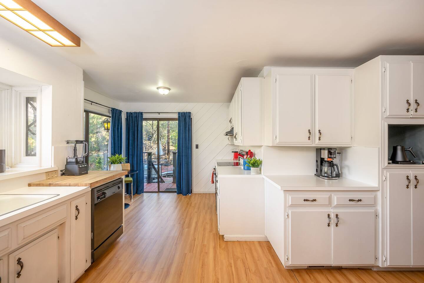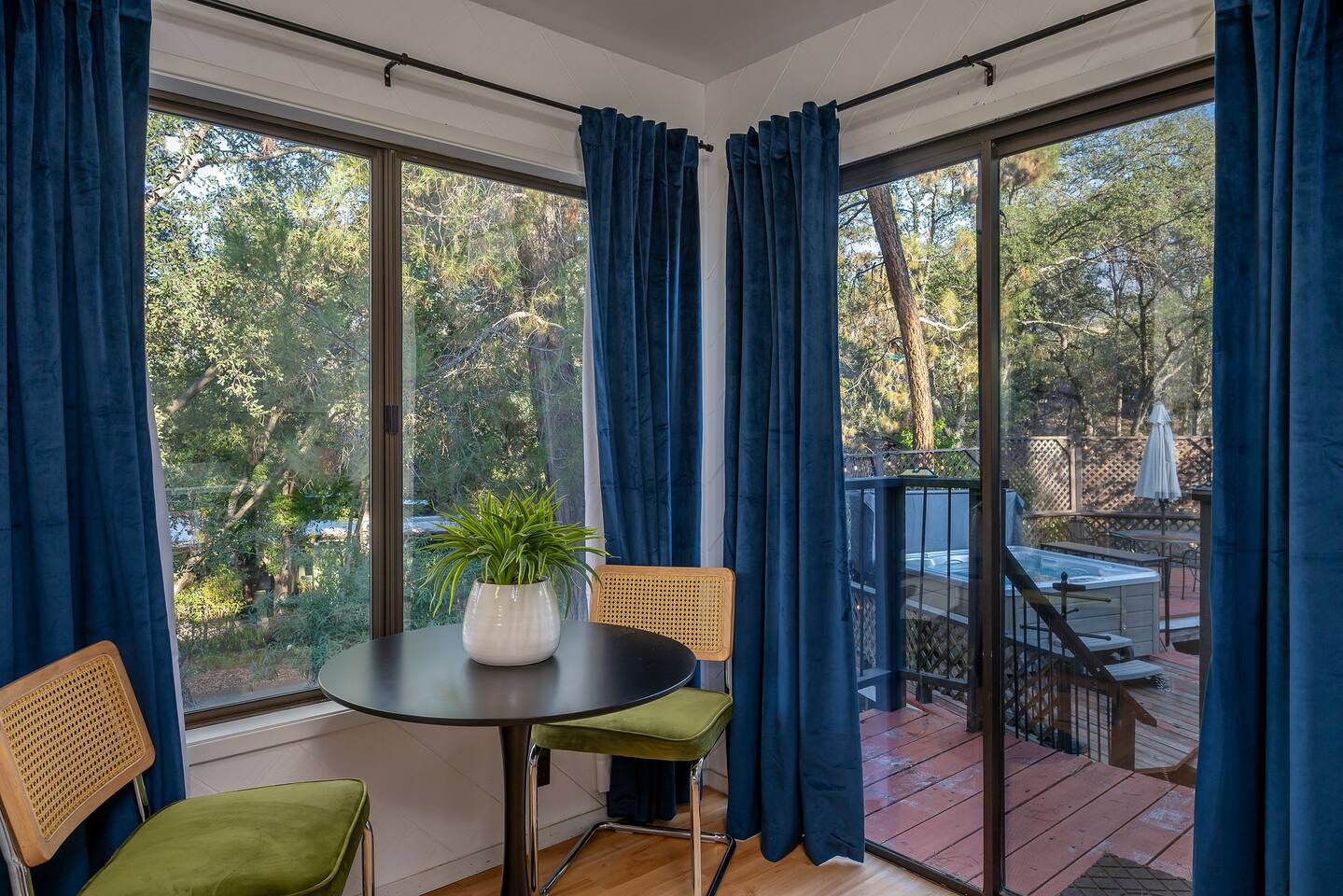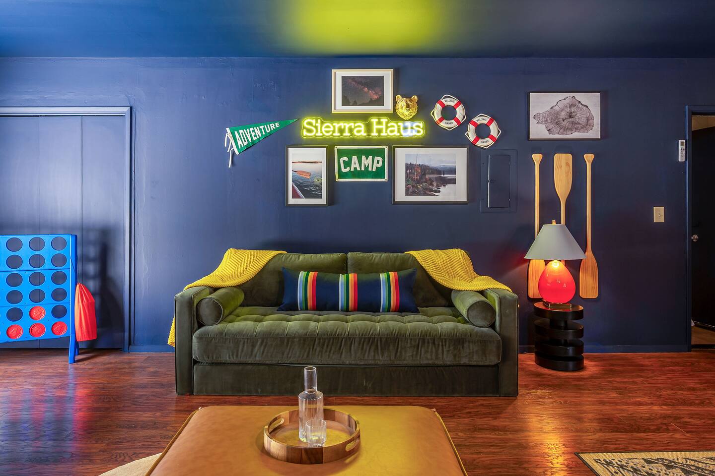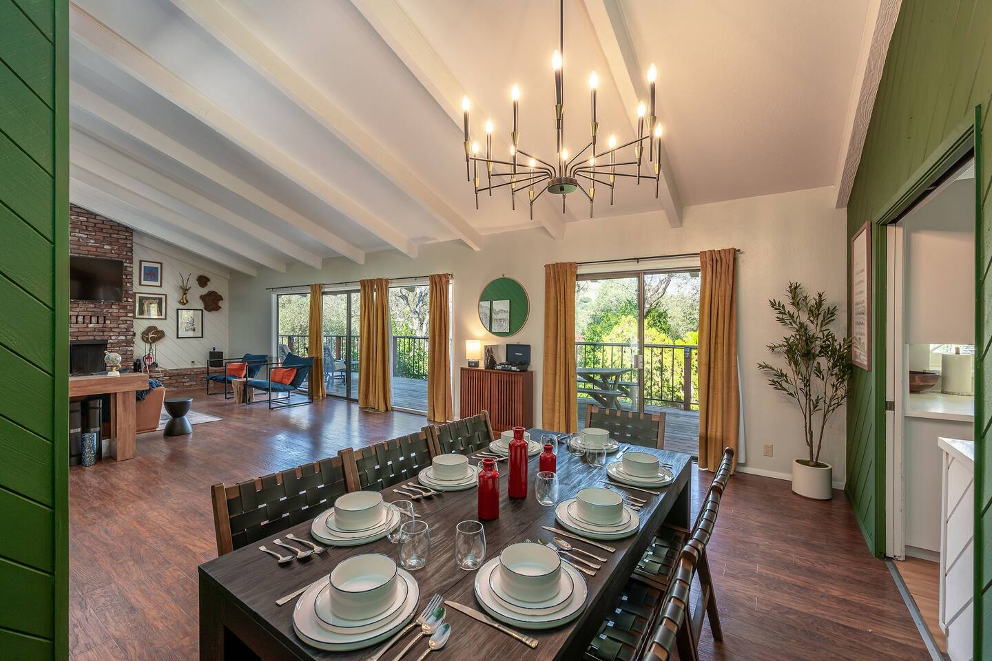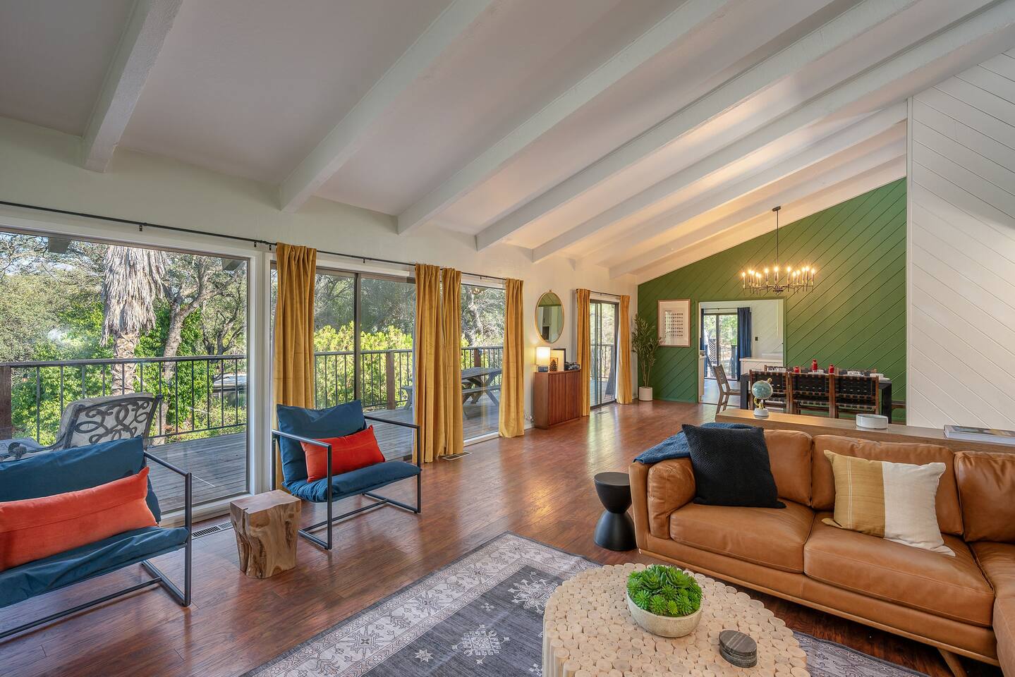 YOUR PROPERTY This beautiful home offers the perfect balance of style, comfort, and functionality. Two spacious bedrooms, two full bathrooms, and a half bath ensure plenty of space for everyone. Each bathroom is thoughtfully stocked with essentials, so you can relax and focus on enjoying your stay. KITCHEN & DINING The full kitchen is fully equipped with modern appliances, ample counter space, and everything you need to prepare meals with ease. Just off the kitchen, the dining area features a large table set beneath a modern chandelier, accented by striking green walls and Sequoia National Park artwork — the perfect backdrop for shared meals and conversation. BEDROOMS & BATHROOMS Each bedroom offers a cozy retreat designed for comfort. Bedroom 1 features warm tones and a spacious layout, while Bedroom 2 adds a vibrant, modern flair with bold design and direct access to nearby amenities. Both full bathrooms are bright and spacious, offering large vanities and clean finishes. The additional half bathroom adds extra convenience for guests. BONUS ROOMS Enjoy dedicated workspaces in the bedrooms and an entertainment area with a pool table, dartboard, arcade games, and Smart TV. Whether you’re working remotely or unwinding after a day of exploring, this home has you covered. OUTSIDE SPACE Step onto the spacious back deck where you can enjoy a full-size cornhole setup, outdoor seating, and peaceful views of the surrounding oak and pine trees. With over 2 acres of natural landscape, you’ll often spot local wildlife — including wild turkeys strolling through the property.