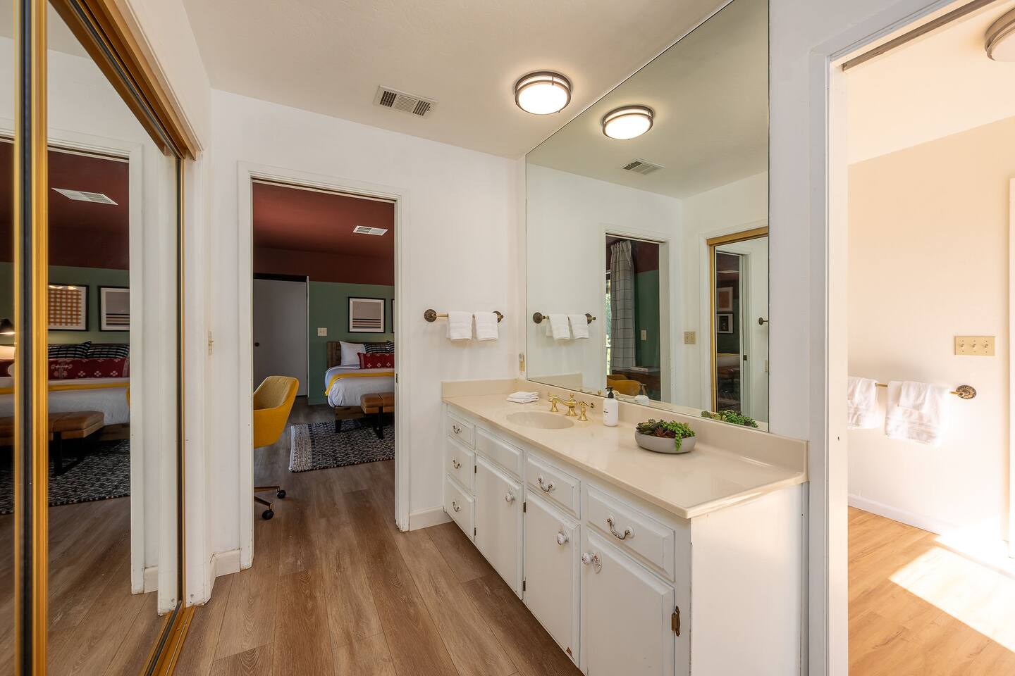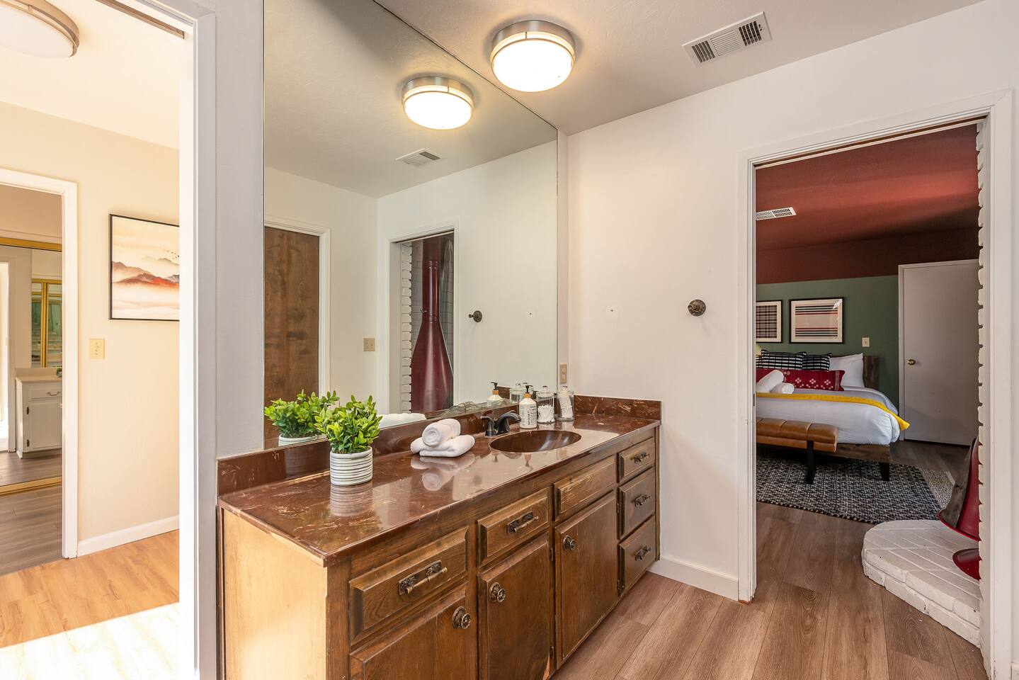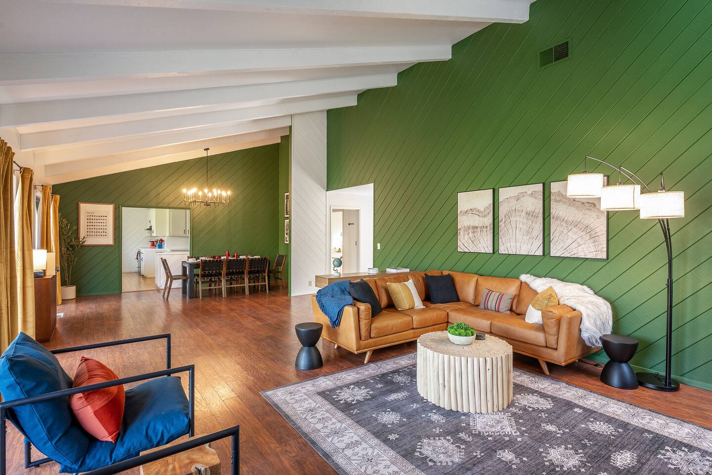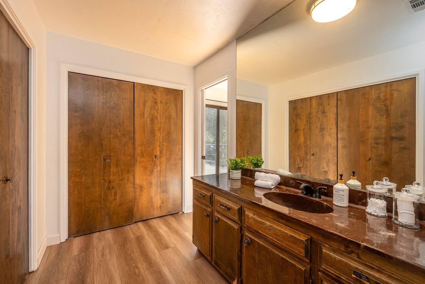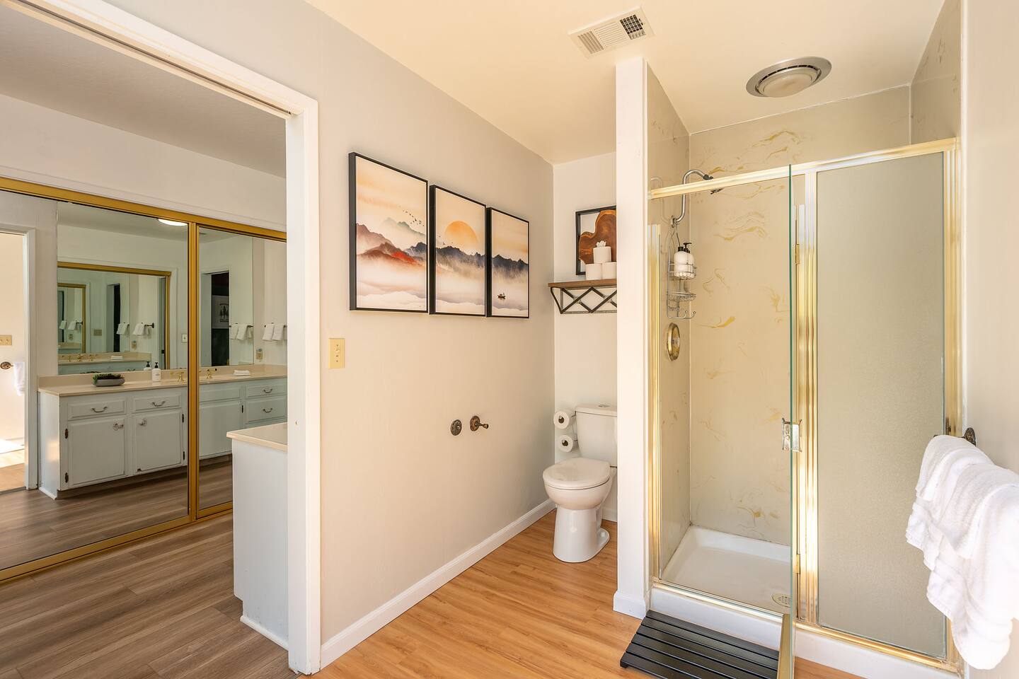 YOUR PROPERTY This beautiful home offers the perfect balance of style, comfort, and functionality. Two spacious bedrooms, two full bathrooms, and a half bath ensure plenty of space for everyone. Each bathroom is thoughtfully stocked with essentials, so you can relax and focus on enjoying your stay. KITCHEN & DINING The full kitchen is fully equipped with modern appliances, ample counter space, and everything you need to prepare meals with ease. Just off the kitchen, the dining area features a large table set beneath a modern chandelier, accented by striking green walls and Sequoia National Park artwork — the perfect backdrop for shared meals and conversation. BEDROOMS & BATHROOMS Each bedroom offers a cozy retreat designed for comfort. Bedroom 1 features warm tones and a spacious layout, while Bedroom 2 adds a vibrant, modern flair with bold design and direct access to nearby amenities. Both full bathrooms are bright and spacious, offering large vanities and clean finishes. The additional half bathroom adds extra convenience for guests. BONUS ROOMS Enjoy dedicated workspaces in the bedrooms and an entertainment area with a pool table, dartboard, arcade games, and Smart TV. Whether you’re working remotely or unwinding after a day of exploring, this home has you covered. OUTSIDE SPACE Step onto the spacious back deck where you can enjoy a full-size cornhole setup, outdoor seating, and peaceful views of the surrounding oak and pine trees. With over 2 acres of natural landscape, you’ll often spot local wildlife — including wild turkeys strolling through the property.