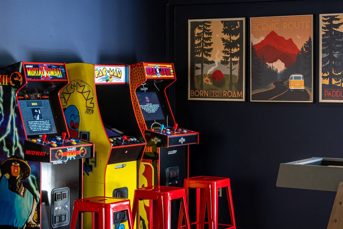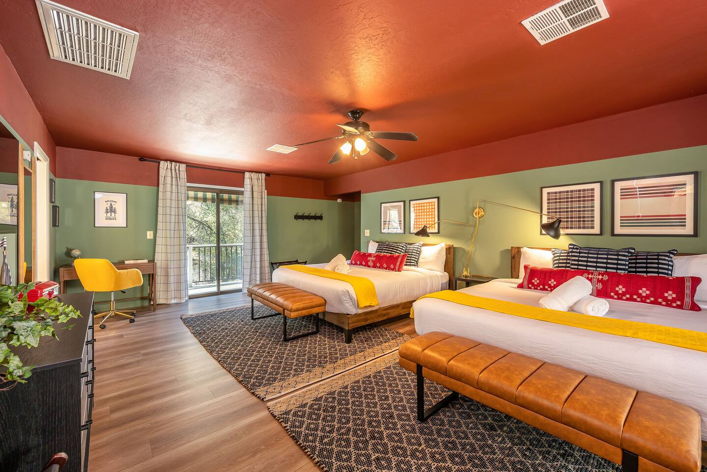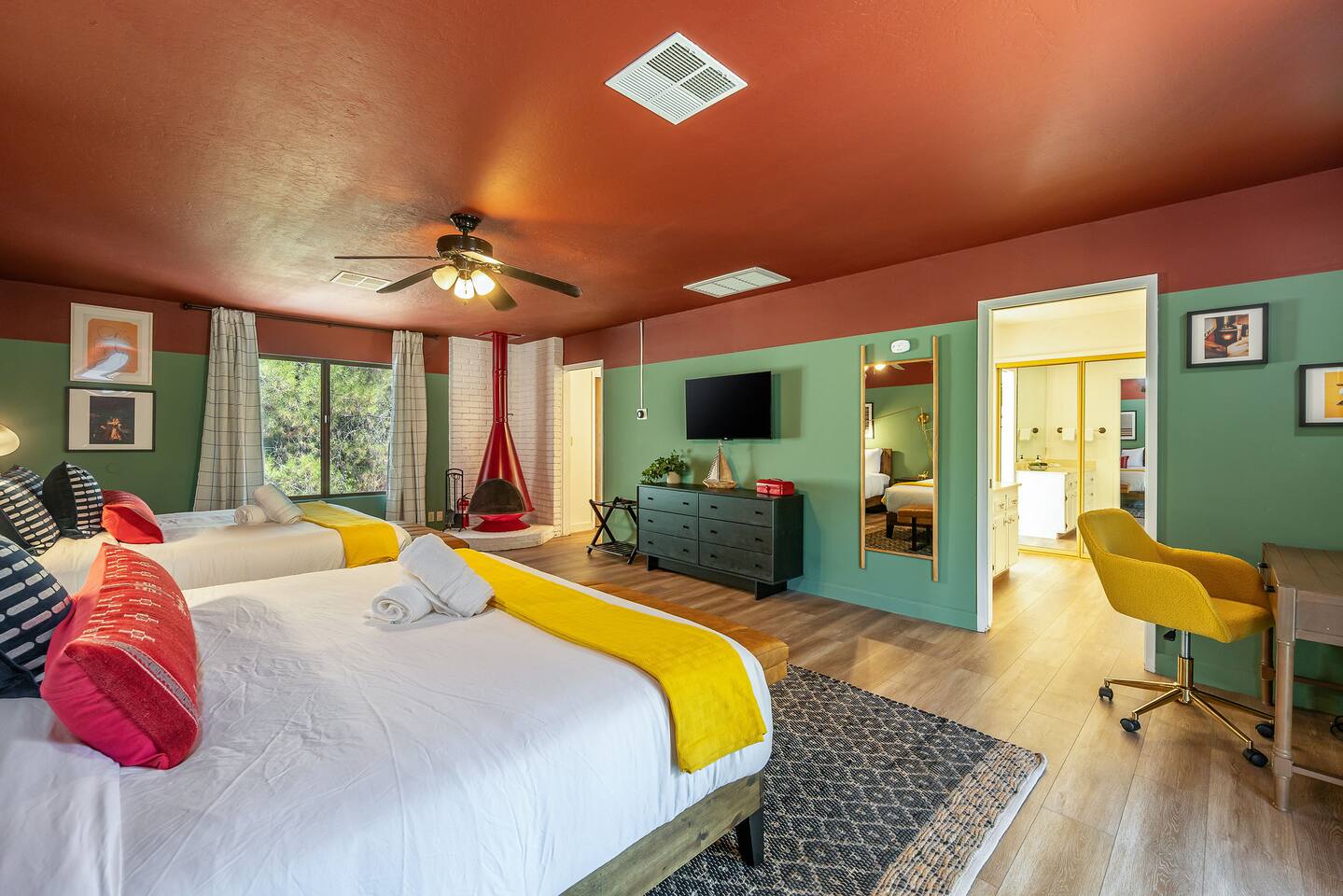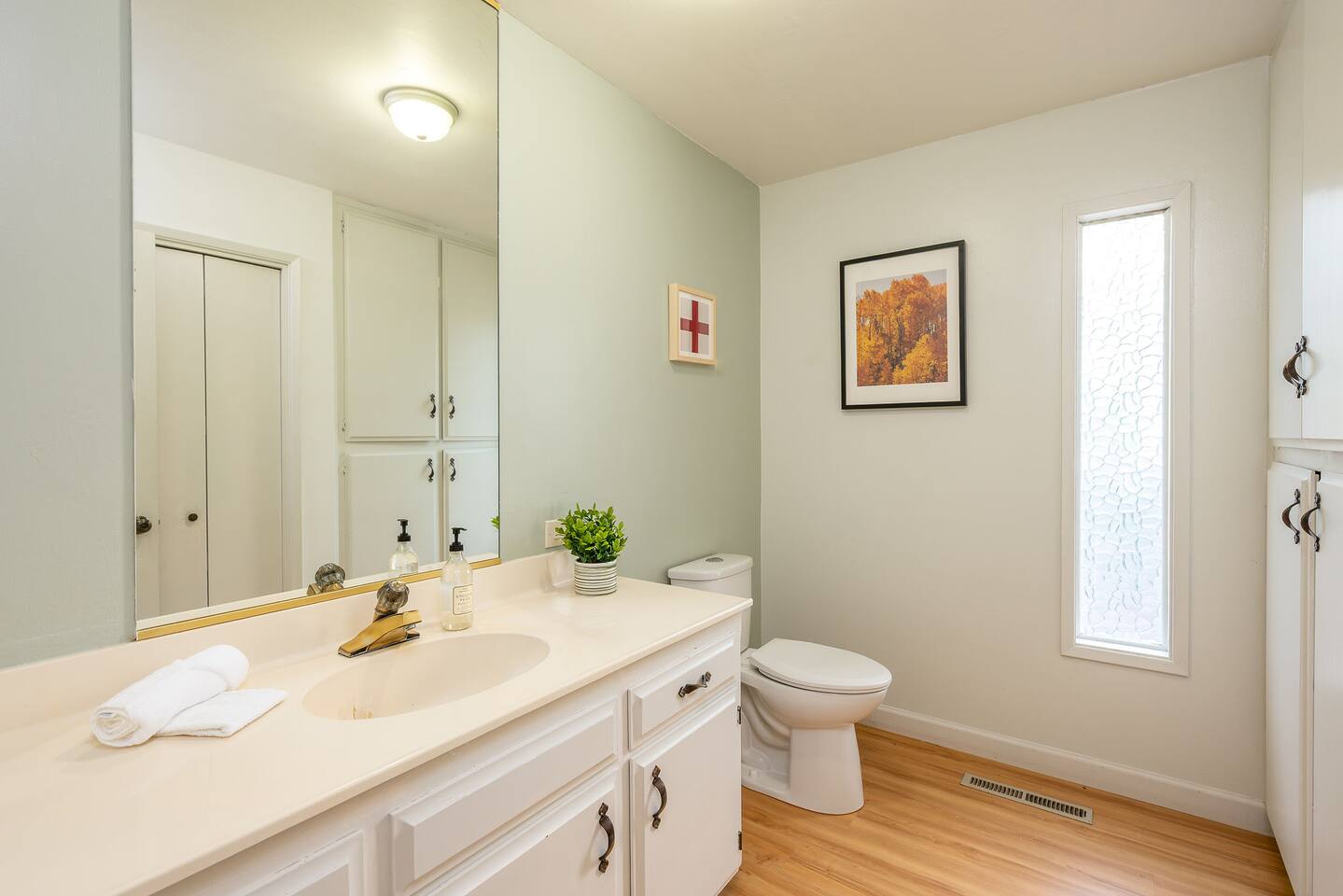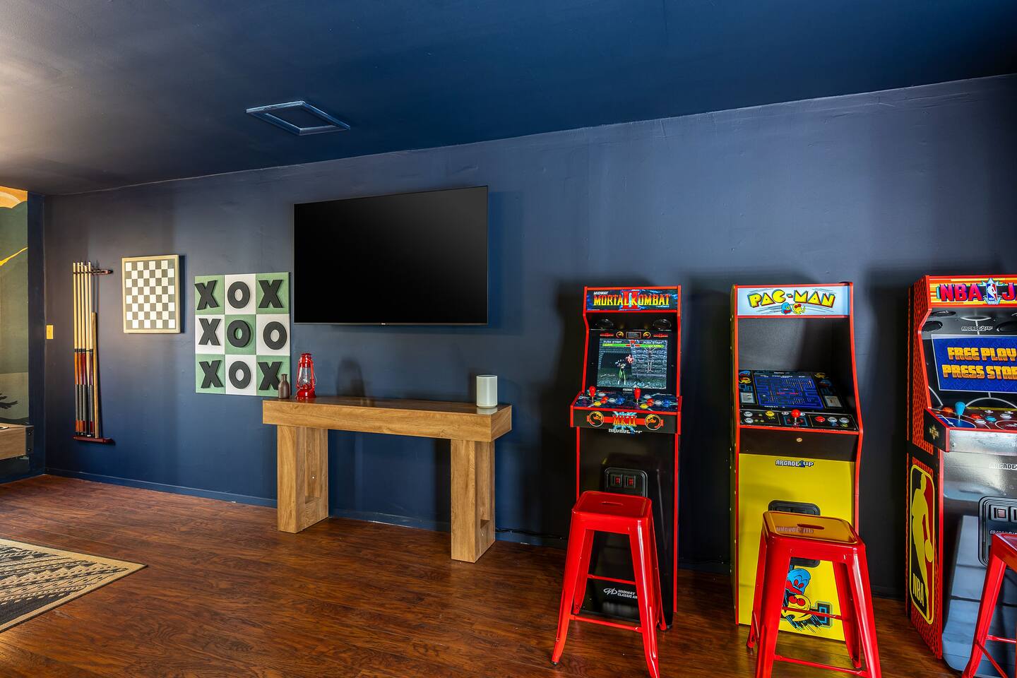 YOUR PROPERTY This beautiful home offers the perfect balance of style, comfort, and functionality. Two spacious bedrooms, two full bathrooms, and a half bath ensure plenty of space for everyone. Each bathroom is thoughtfully stocked with essentials, so you can relax and focus on enjoying your stay. KITCHEN & DINING The full kitchen is fully equipped with modern appliances, ample counter space, and everything you need to prepare meals with ease. Just off the kitchen, the dining area features a large table set beneath a modern chandelier, accented by striking green walls and Sequoia National Park artwork — the perfect backdrop for shared meals and conversation. BEDROOMS & BATHROOMS Each bedroom offers a cozy retreat designed for comfort. Bedroom 1 features warm tones and a spacious layout, while Bedroom 2 adds a vibrant, modern flair with bold design and direct access to nearby amenities. Both full bathrooms are bright and spacious, offering large vanities and clean finishes. The additional half bathroom adds extra convenience for guests. BONUS ROOMS Enjoy dedicated workspaces in the bedrooms and an entertainment area with a pool table, dartboard, arcade games, and Smart TV. Whether you’re working remotely or unwinding after a day of exploring, this home has you covered. OUTSIDE SPACE Step onto the spacious back deck where you can enjoy a full-size cornhole setup, outdoor seating, and peaceful views of the surrounding oak and pine trees. With over 2 acres of natural landscape, you’ll often spot local wildlife — including wild turkeys strolling through the property.